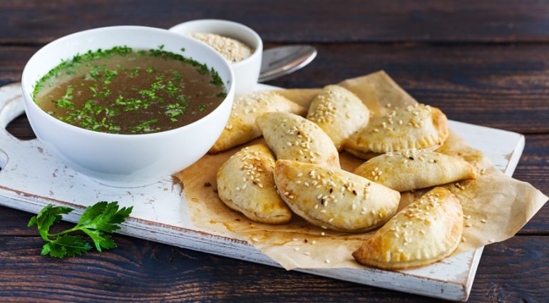 Тесто, лук, отварная говядина и бульон – все, что нужно для пирожков с мясом
