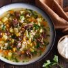 В глубокую миску разбить яйца, влить бульон и тщательно взбить венчиком. Приправить солью, перцем. Добавить небольшое количество яичной смеси фаршу и хорошо перемешать. Разложить фарш по небольшим огнеупорным формочкам (не более чем 1/3 от общего объема), залить яичной смесью и посыпать нарубленным зеленым луком. Каждую форму накрыть пищевой пленкой, а поверх ее фольгой. Поставить в пароварку и накрыть крышкой. Первые 10 минут варить на сильном пару. Затем убавить огонь и держать еще 20–30 минут. Подавать сразу же, посыпав мелко нарубленным зеленым луком. |