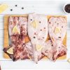 - Рыбу крупно нарежьте, посолите и поперчите. Шампиньоны протрите салфеткой или бумажными полотенцами, выломайте ножки. Ножки нарежьте тонкими кружочками, шляпки разрежьте пополам или на четвертинки.
