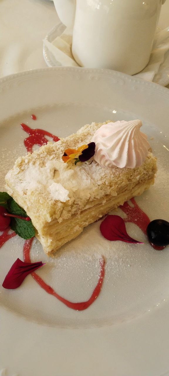 Жульен был нежный, под золотистой корочкой сыра. Сырная тарелка — не просто набор кусочков, а композиция: с медом, желтым как янтарь, миндалем, виноградом, припудренным сахарной пудрой, цукатами и листочкам мяты. Суп с морепродуктами — легкий, но насыщенный, с нотками пряностей. Десерты вкусные, не приторные и не чрезмерно жирные — классический «Наполеон», далекий от традиционного «Чизкейк» мягкой кремовой текстуры, украшенный цукатами. Лимонады здесь делают сами — порадовала свежесть смородины, переплетающаяся с прохладой мяты. Почти в каждом блюде, кроме супа и жульена были живые цветы, например, фиалки.