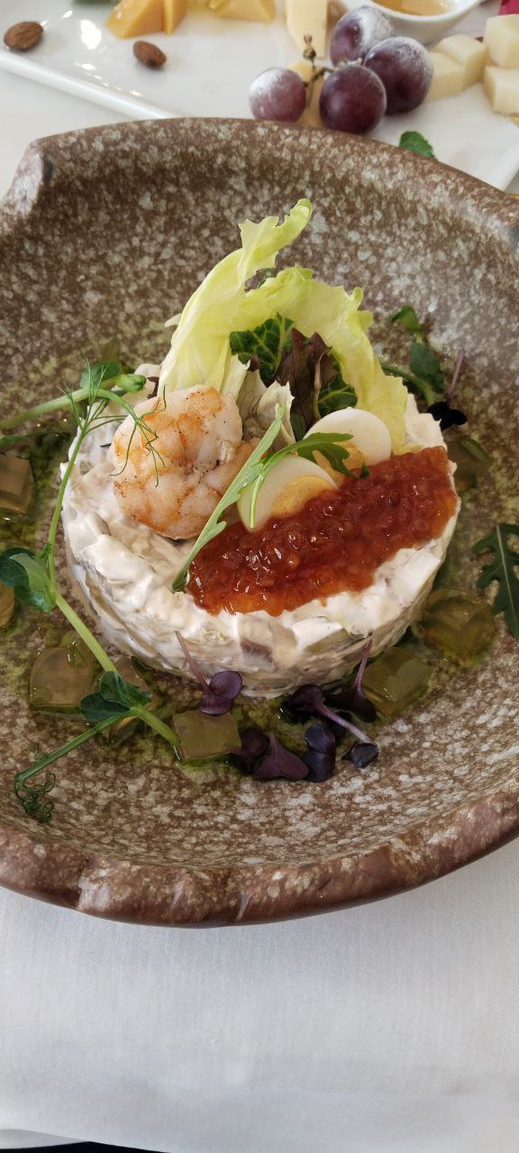Оливье подали с алой икрой и креветкой на вершине, будто шеф-повар решил переосмыслить советскую классику, облачив ее в бархат и жемчуг. По краям оливье был украшен зеленым огуречным желе — квадратными кусочками, которые растаяли в процессе еды и очень освежали вкус.