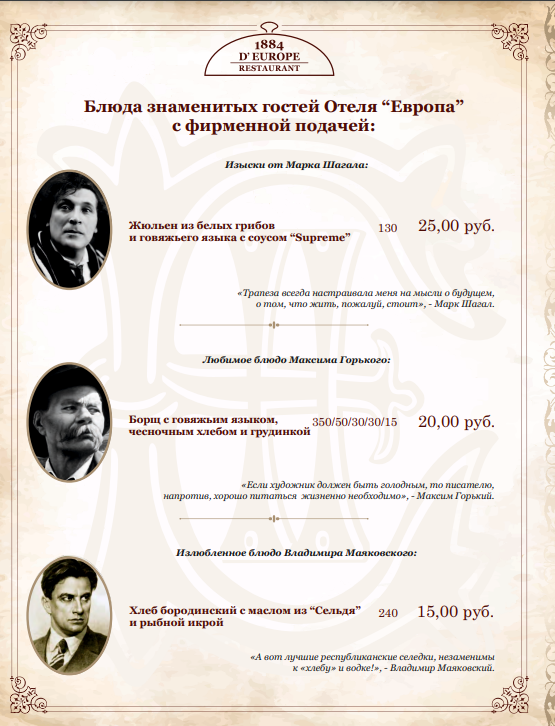 В зале высокие потолки, красивые тюли и портьеры, зеркала в золоченых рамах. Когда-то здесь бывали знаменитые люди — Шагал, Маяковский, Горький и многие другие. Их портреты встречают гостей прямо на первых страницах меню, рядом описаны блюда, которые они любили.